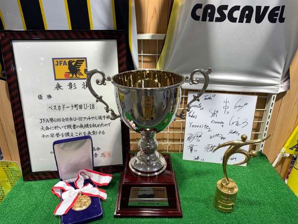 優勝トロフィー・表彰状・メダル・フェアプレートロフィーをお持ちいただいたので、店内で飾らせて頂いています!