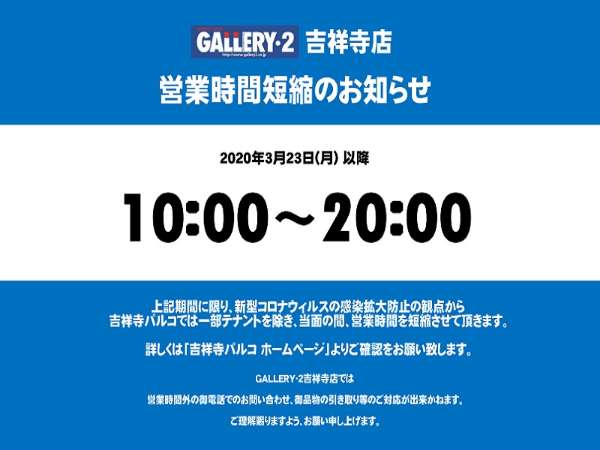 3月23日(月)以降の営業時間は吉祥寺PARCO全館10:00~20:00となります。