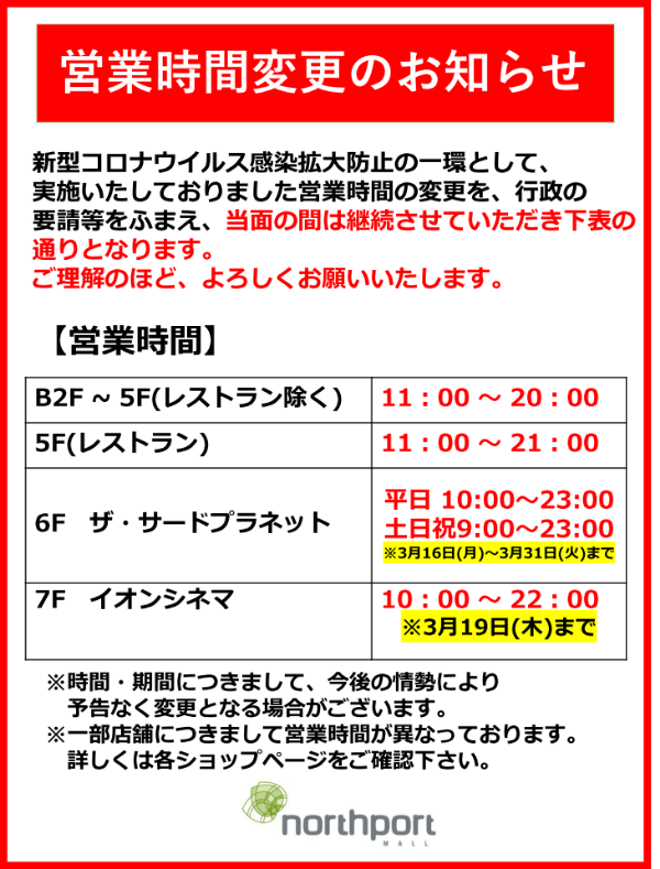 ノースポートモールでは、新型コロナウイルス感染拡大防止の一環とし実施しておりました営業時間の変更を、
